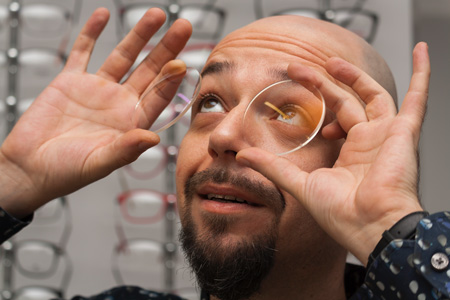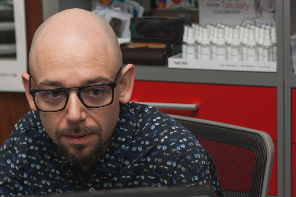 Technik optyk, Paweł Rutkowski, dobiera oprawy, wykonuje i naprawia uszkodzone okulary korekcyjne i inne pomoce wzrokowe.