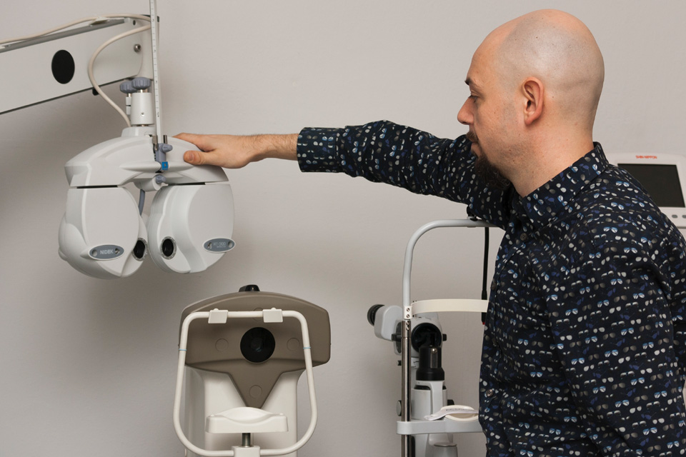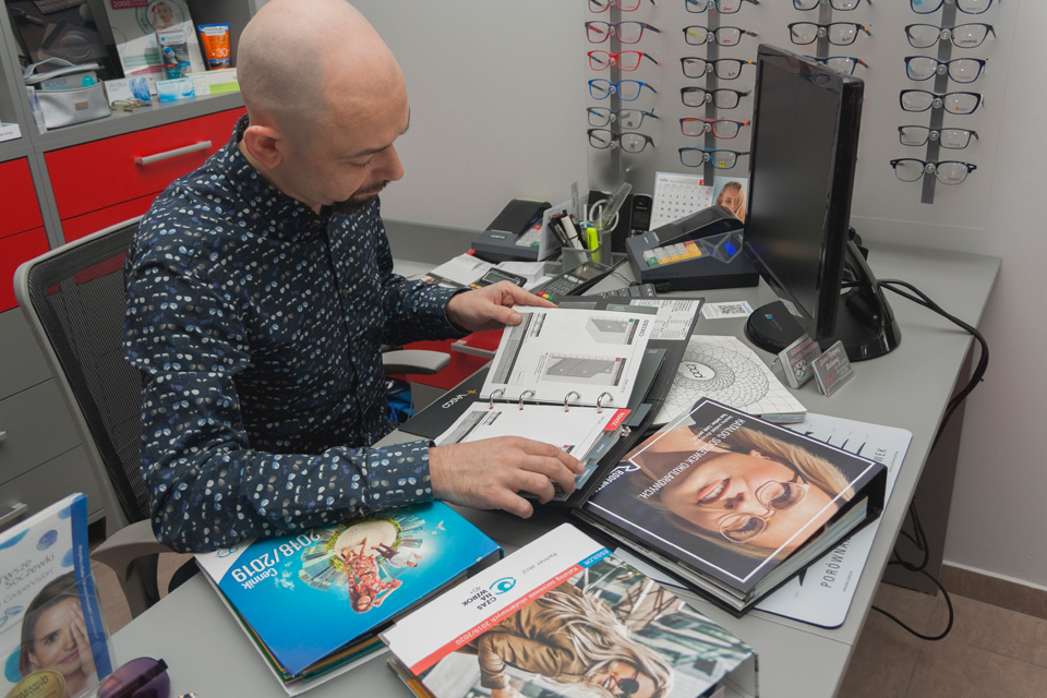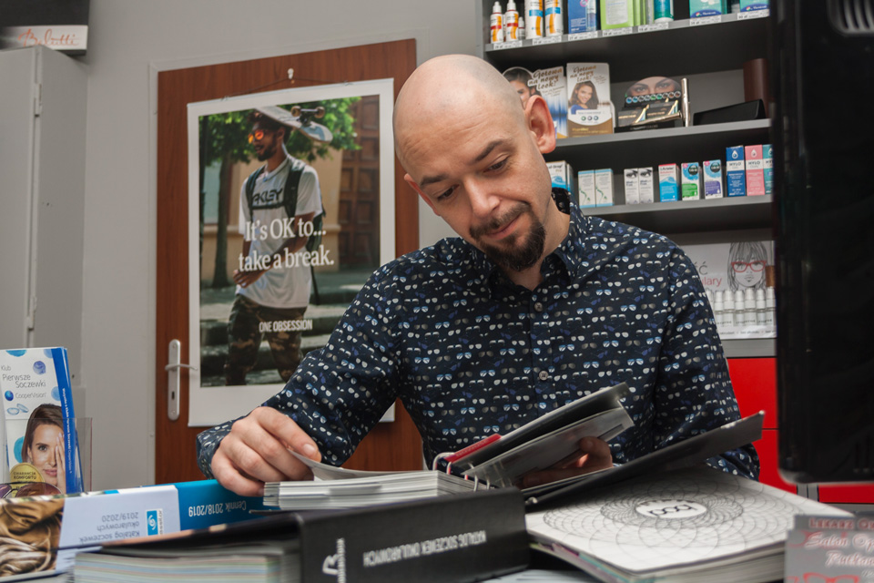 Technik optyk, Paweł Rutkowski, dobiera oprawy, wykonuje i naprawia uszkodzone okulary korekcyjne i inne pomoce wzrokowe.